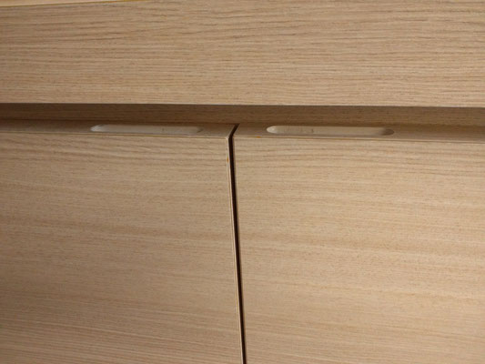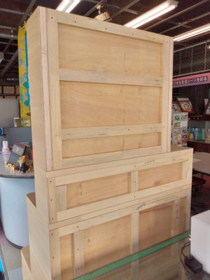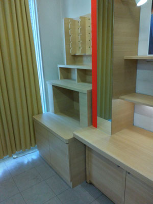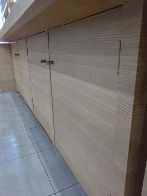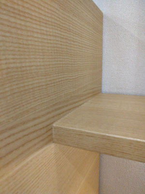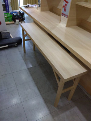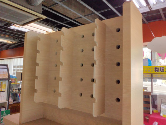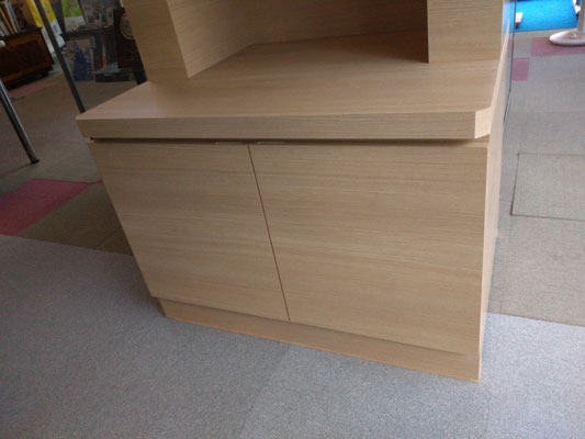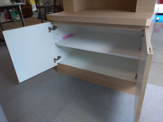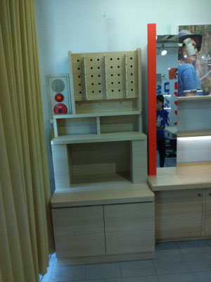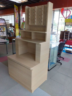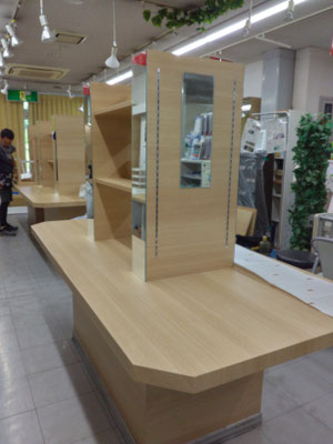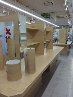 こちらは什器リニューアル前の様子です。什器の色は白でした。その上から明るい木目調のダイノックを施工してイメージチェンジをしました。下のギャラリーでダイノックシート貼のクオリティの高さをご堪能ください。