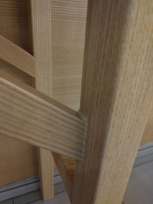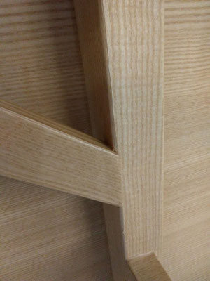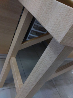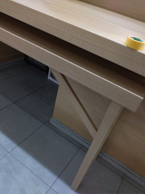 こちらは新規に製作した木製の什器です。隙間に納まるよう専用設計で商品の眼鏡を展示できるよう様々な工夫を凝らしました。最も特徴的なのが最上段の眼鏡かけです。商品を並べるのに最適化するために試作を繰り返しました。